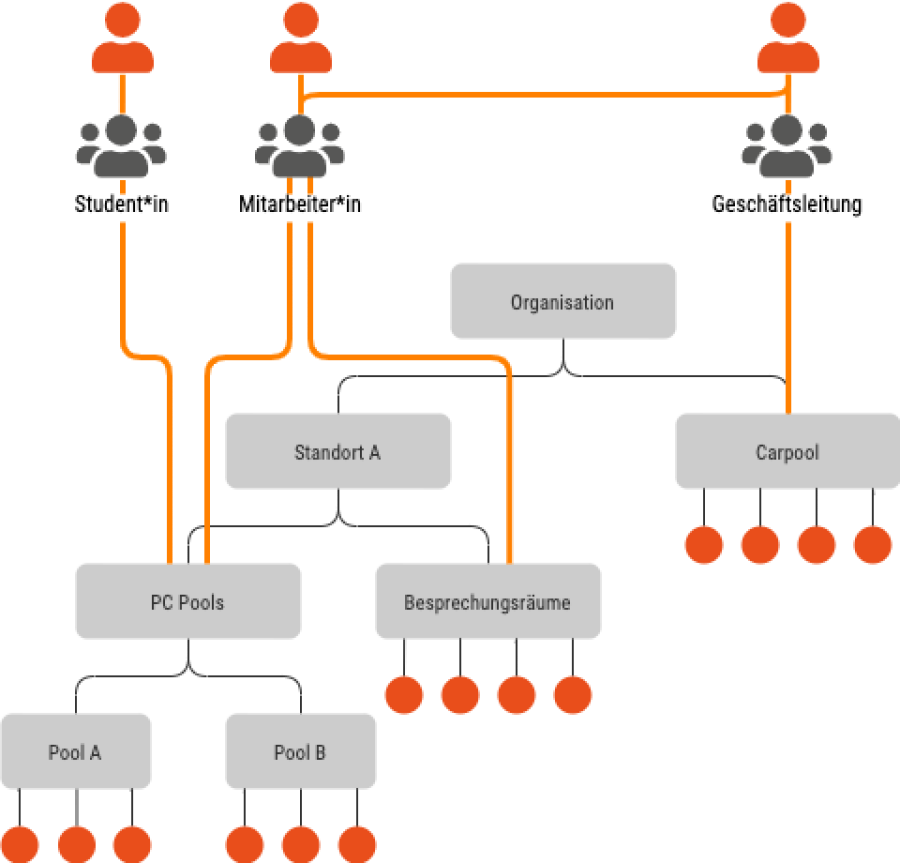 Anne Apfel hat die Rolle „Student*in“ und so Buchungsrechte auf die PC-Pools und Besprechungsräume. Bei den Besprechungsräumen hat Sie die Besonderheit, dass diese von einem Mitarbeiter genehmigt werden muss. Bernd Blume und Clara Clever können die Buchung genehmigen, oder ablehnen.