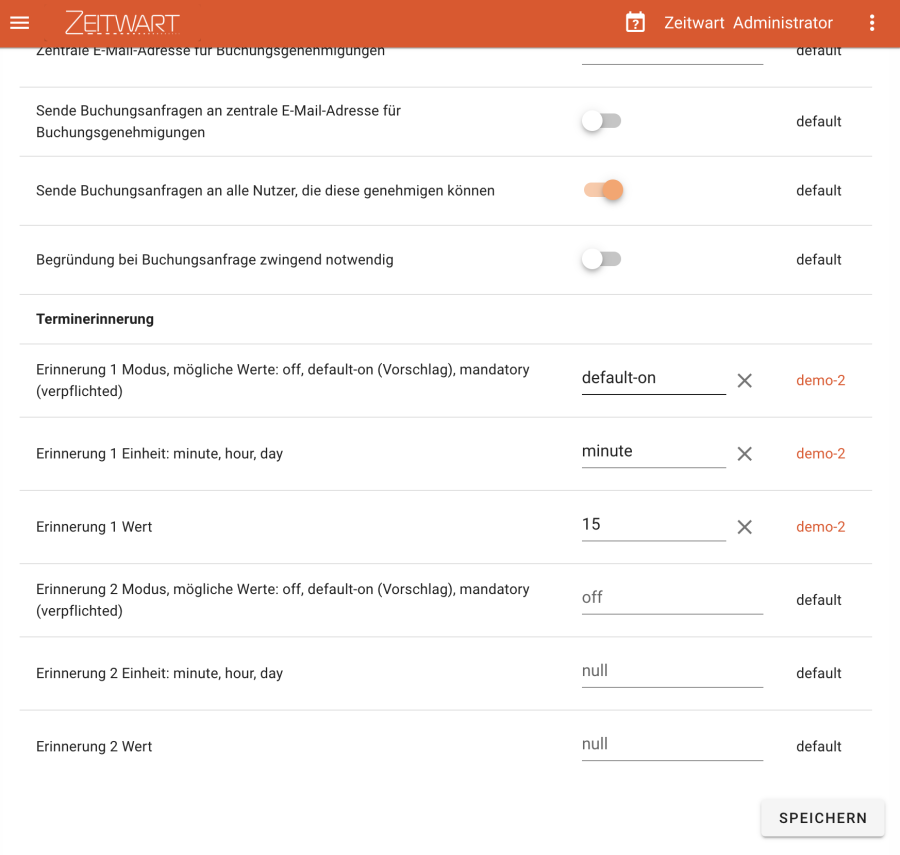 Diese Werte sind in den Organisationseinheiten vererbbar und können als Standardwerte sowohl für die ganze Organisation ("Default"), als auch auf Ebene einzelner Organisationseinheiten vorgegeben werden: