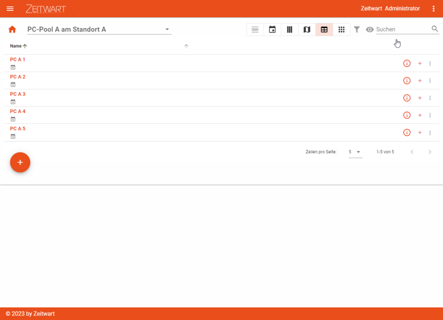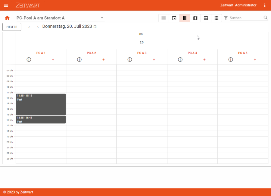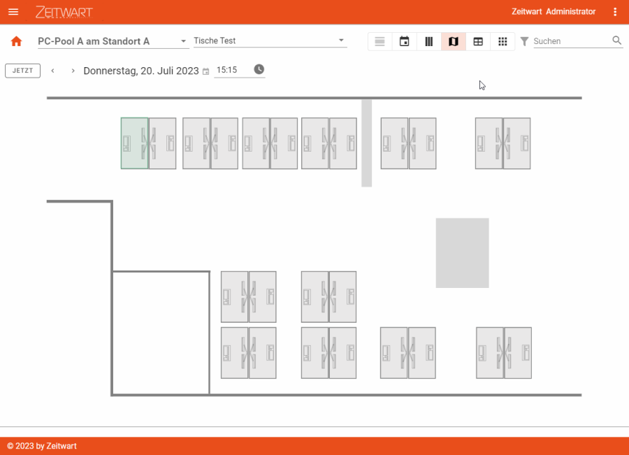 The core competence of this view in Zeitwart is the focus on the current occupancy or the current availability. The "Map" view allows you to find out more quickly where a resource is still available right now than the "Calendar view" and the "Calendar columns". The "Map" view is therefore particularly suitable for ad hoc bookings, while the other two views are particularly suitable for planned, future bookings.