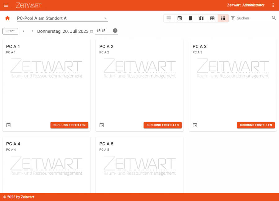 In Zeitwart, the tile view allows you to make resources bookable using a tile with a background image. The view is very low-threshold and primarily aims to present the resource as such, so that you immediately have an idea of what you are dealing with in the resource. In all other views, you have to click on the "i" symbol.