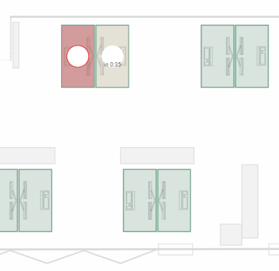 This view not only allows you to access the resources very intuitively, as you know exactly where they are located and how the other resources are distributed based on the map. It also allows you to see the current occupancy of the resources, whereby a distinction is made between three statuses: "green" corresponds to "free", "red" corresponds to "occupied", "yellow" means "soon occupied". While "red" bookings show you the start and end times when you hover over them with the mouse pointer, "yellow" bookings also show you when the next booking will start (e.g. "in 0:35" = the next booking will start in 35 minutes):