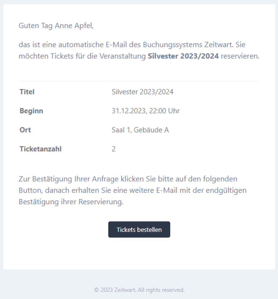 Sobald nun über "Tickets bestellen" die Reservierungsanfrage ausgelöst wurde, bekommt Anne eine E-Mail, in der sie aufgefordert wird, ihre Reservierungsanfrage zu bestätigen:
