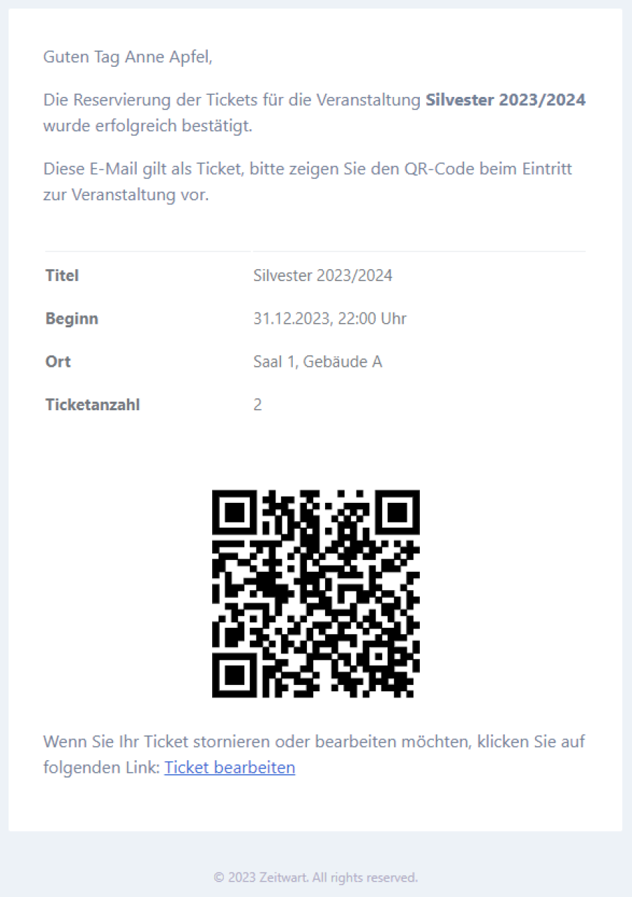 Klickt Anne in der E-Mail auf "Tickets bestellen", so bekommt sie daraufhin eine weitere E-Mail mit einem QR-Code, der als Eintrittskarte genutzt werden kann: