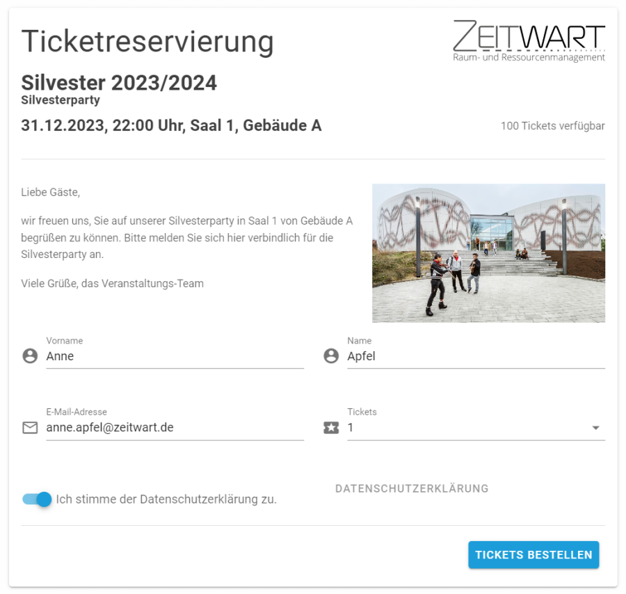 In unserem Beispiel möchte Anne Apfel Tickets für eine Silvesterparty buchen.