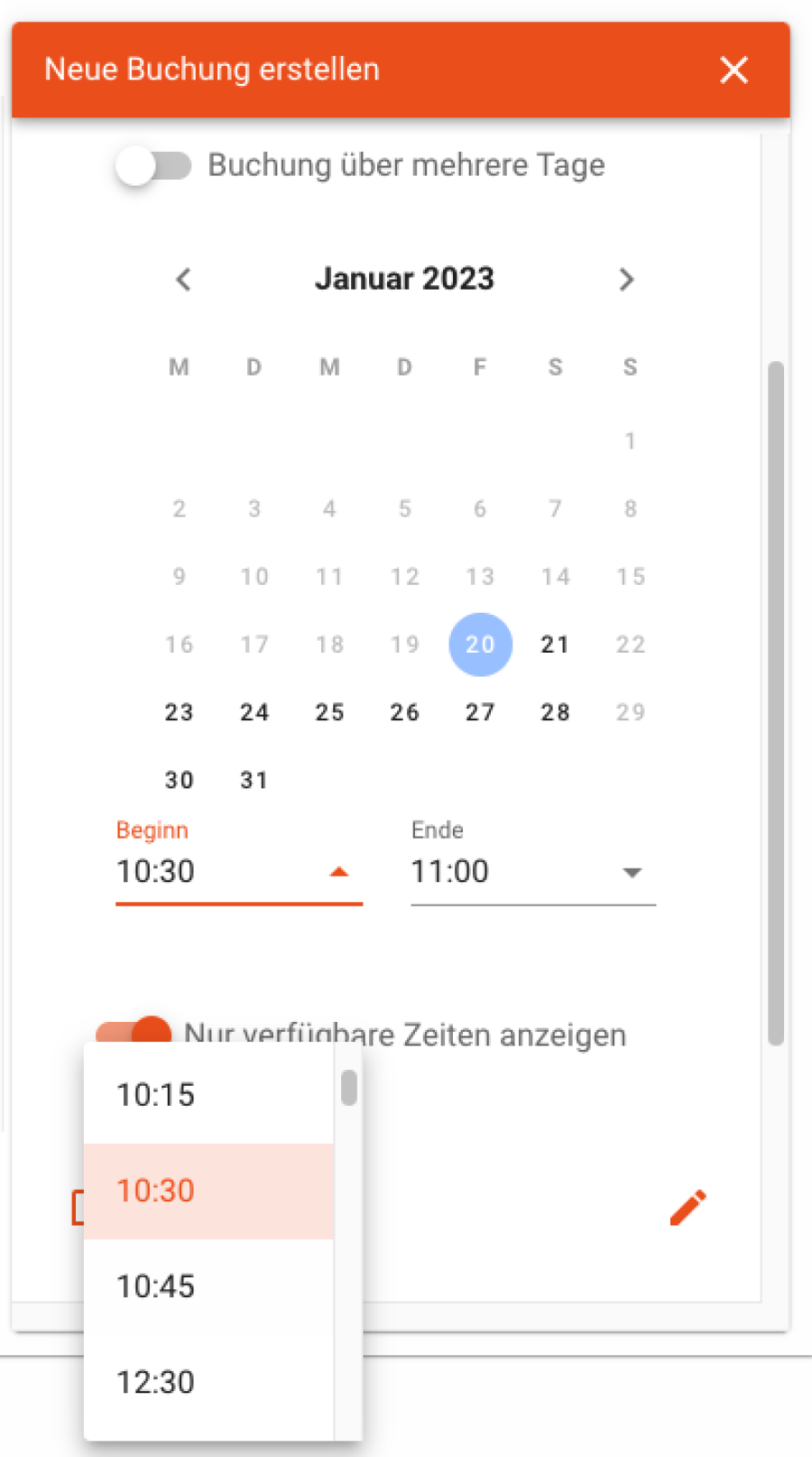 The opening times are taken into account in the booking dialogue. Only the available times/dates are displayed for both the date and the times.